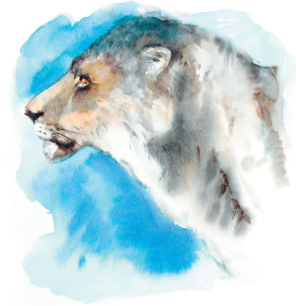 Густые гривы украшали шеи двух львов. Это были самцы – коренастые и плотные, с головами, будто высеченными из камня; львицы были ниже ростом, с гибкими и удлинёнными телами. У всех пятерых были широко открытые жёлтые глаза, способные глядеть вперёд, в одну точку, подобно глазам человека.