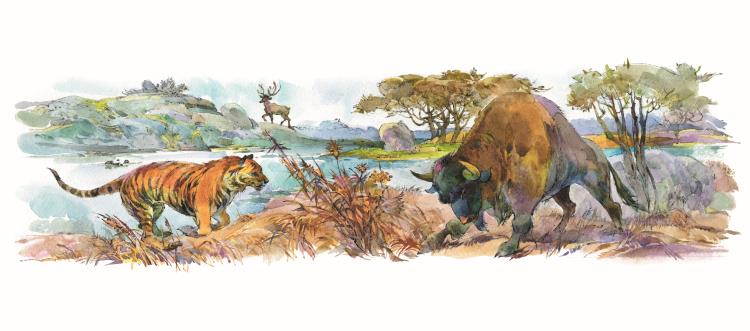 Запах людей напомнил бизону, как однажды, когда он был ещё мал и слаб, человек тяжко ранил его острым камнем. Бизон бросился в сторону и стремглав понёсся к лесу; он уже почти достиг опушки, когда снова завидел тигра, который приближался огромными скачками.