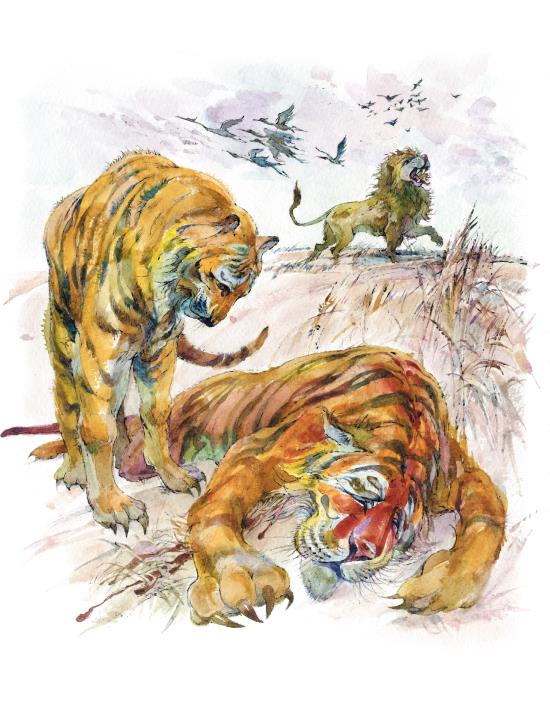 Теперь настала очередь пещерного льва усомниться в своей силе. Вероятнее всего, он без боя уступил бы чете тигров её владения, если бы, возбуждённый угрожающим рычанием своей самки, тигр-самец не прыгнул ему навстречу…