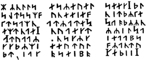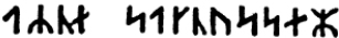Дядюшка поднял повыше очки, взял сильную лупу и тщательно просмотрел первые страницы книги. На обороте второй страницы он открыл что-то вроде пятна, похожего на чернильную кляксу; но, вглядевшись в него, можно было различить несколько наполовину стертых знаков. Дядя понял, что именно на это место надо обратить наибольшее внимание; он принялся чрезвычайно старательно рассматривать его и разглядел наконец с помощью лупы следующие рунические письмена, которые и прочел без всякого затруднения: