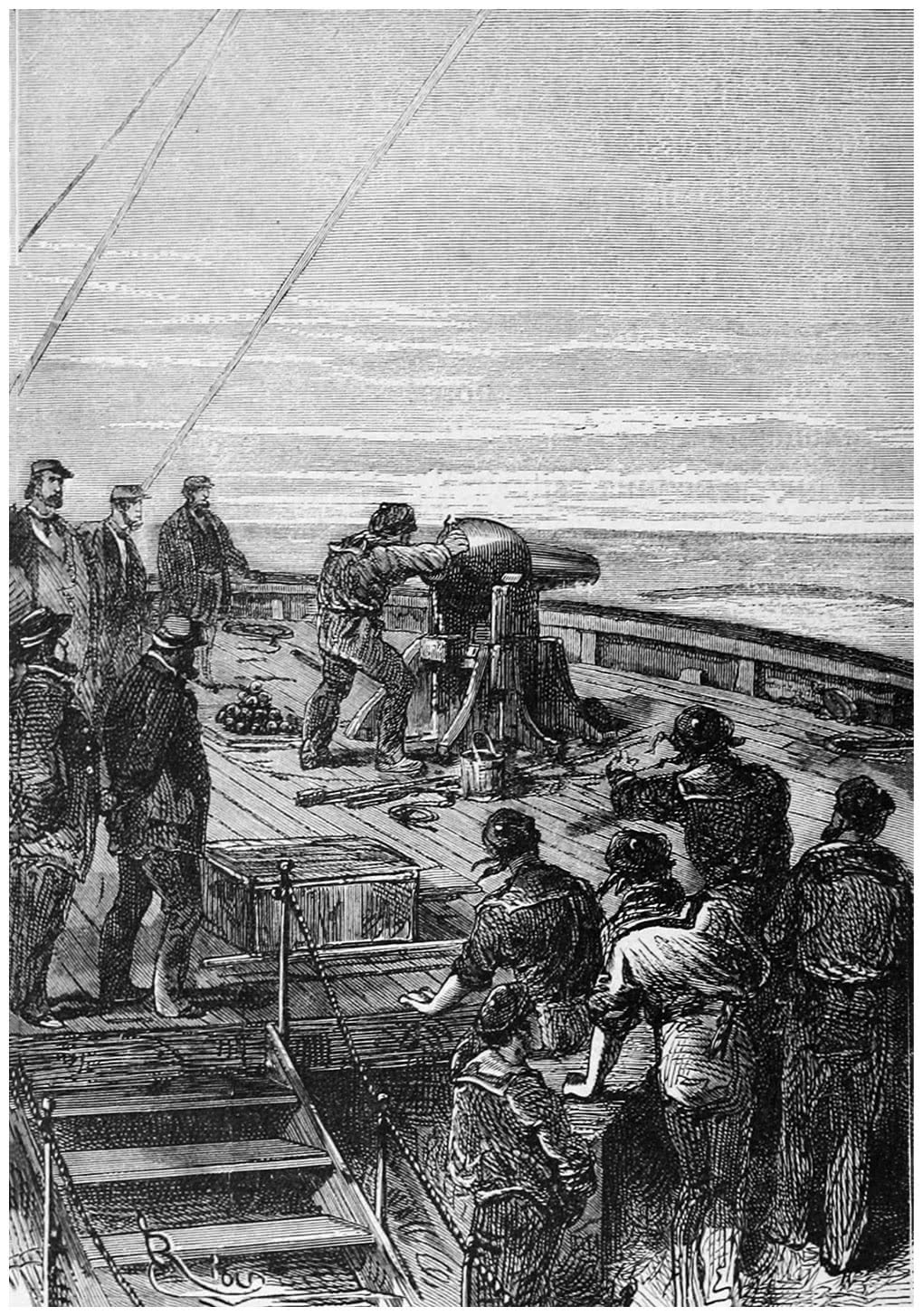 Установленную на баке пушку немедленно зарядили и навели на цель. Грянул выстрел, однако пущенный снаряд прошел в нескольких футах над китом, державшимся на расстоянии в полмили.