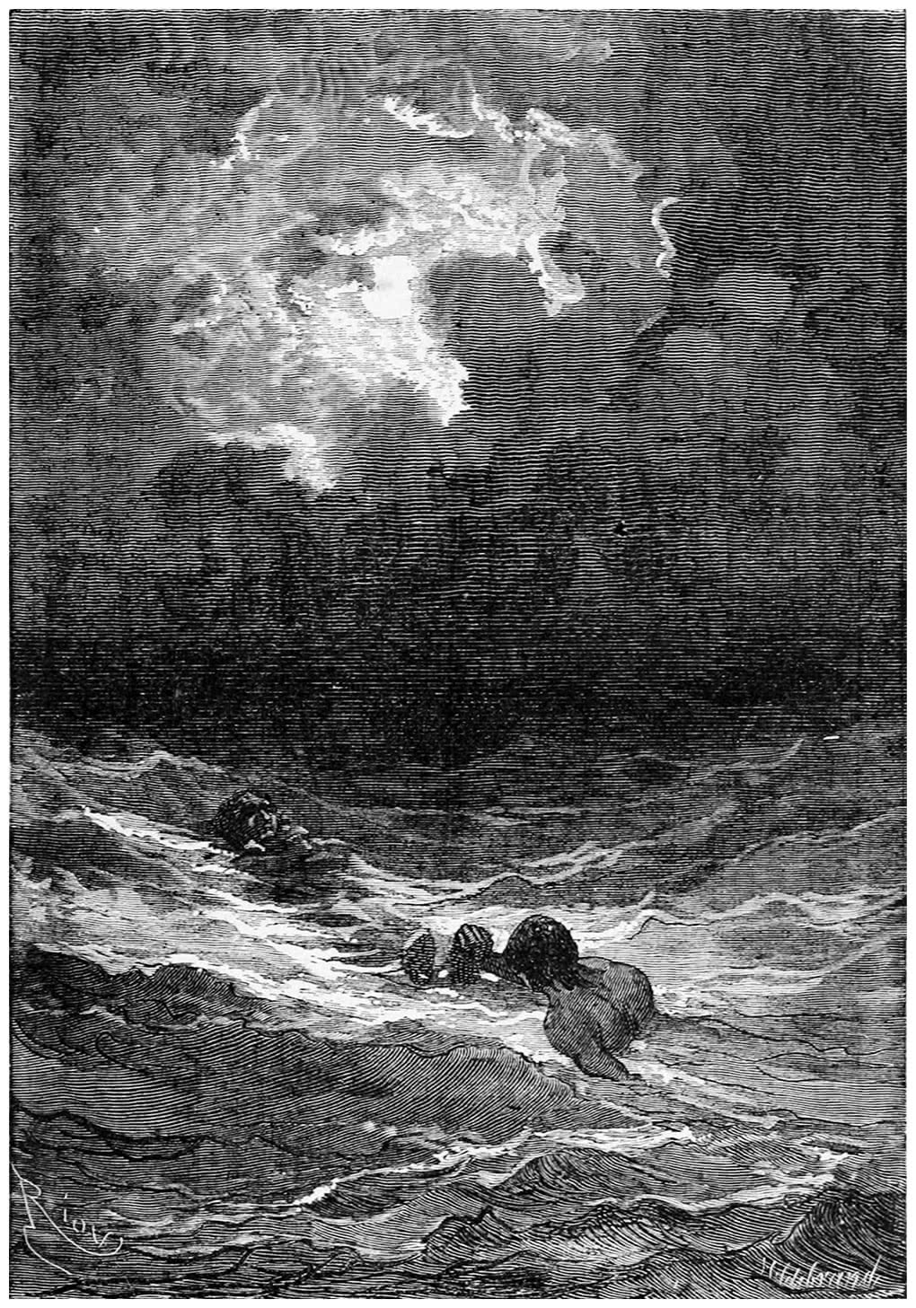 Консель собрал последние силы, оперся на мое плечо, что потребовало от меня невероятного напряжения, высунулся наполовину из воды и в изнеможении рухнул обратно.