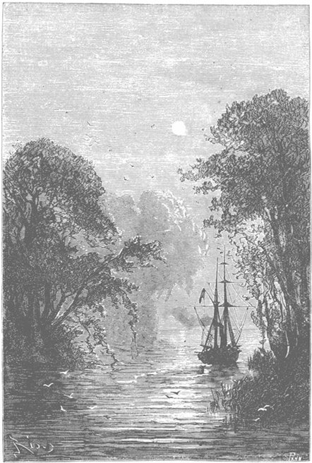 «Дункан» проплыл вдоль этих пустынных берегов. На рассвете он плыл по узкому проливу перешейка, между буковыми, ясеневыми и березовыми лесами.