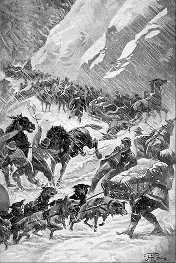 Оставив Скагуэй, Билл направился к Дайи, следуя по восточному берегу канала. Его сани, менее нагруженные, чем другие, поднимавшиеся к горам, легко могли бы опередить их, но дорога была уже загромождена. В мутной пелене снежных метелей, которые свирепствуют в этих узких ущельях, поднимая ослепляющие тучи снега, попадались только всякого рода повозки, стоявшие поперек дороги или опрокинутые, причем животные, несмотря на крики и удары, отказывались двигаться. Всё это сопровождалось самыми грубыми сценами. Одни старались протиснуться вперед, другие изо всех сил стремились помешать этому. Приходилось выгружать и вновь нагружать тяжести. Происходили споры, в воздухе висела брань, сыпались удары, кончавшиеся иногда револьверными выстрелами. При таких препятствиях волей-неволей приходилось держаться в хвосте.