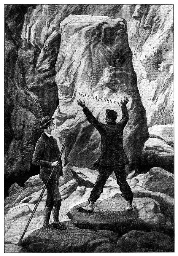 Вдруг дядюшка дико крикнул. Я подумал, что он оступился и падает в зев бездны. Но нет! Он стоял, раскинув руки, расставив ноги, перед гранитной скалой, возвышавшейся в самой середине кратера, подобно грандиозному пьедесталу для статуи Плутона. Во всей позе дядюшки чувствовалось, что он до крайности изумлен, но изумление его сменилось вскоре безумной радостью.