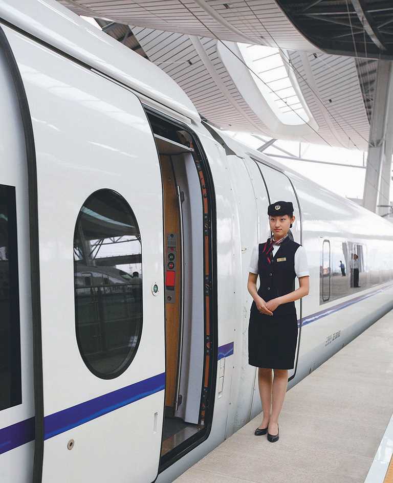 Проводник поезда «Гармония» CRH3 встречает пассажиров в новом стиле (фото: Юань Жуйлунь)