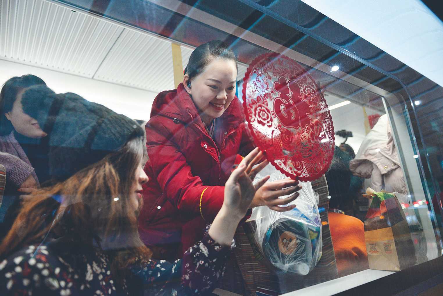 19 февраля 2019 года, «Праздник фонарей», проводники рейса G7 поезда «Возрождение», отправляющегося с Пекинского южного вокзала до станции Шанхай Хунцяо, вместе с пассажирами украшают вагоны и радостно отмечают праздник (фото предоставлено Китайской железнодорожной корпорацией)