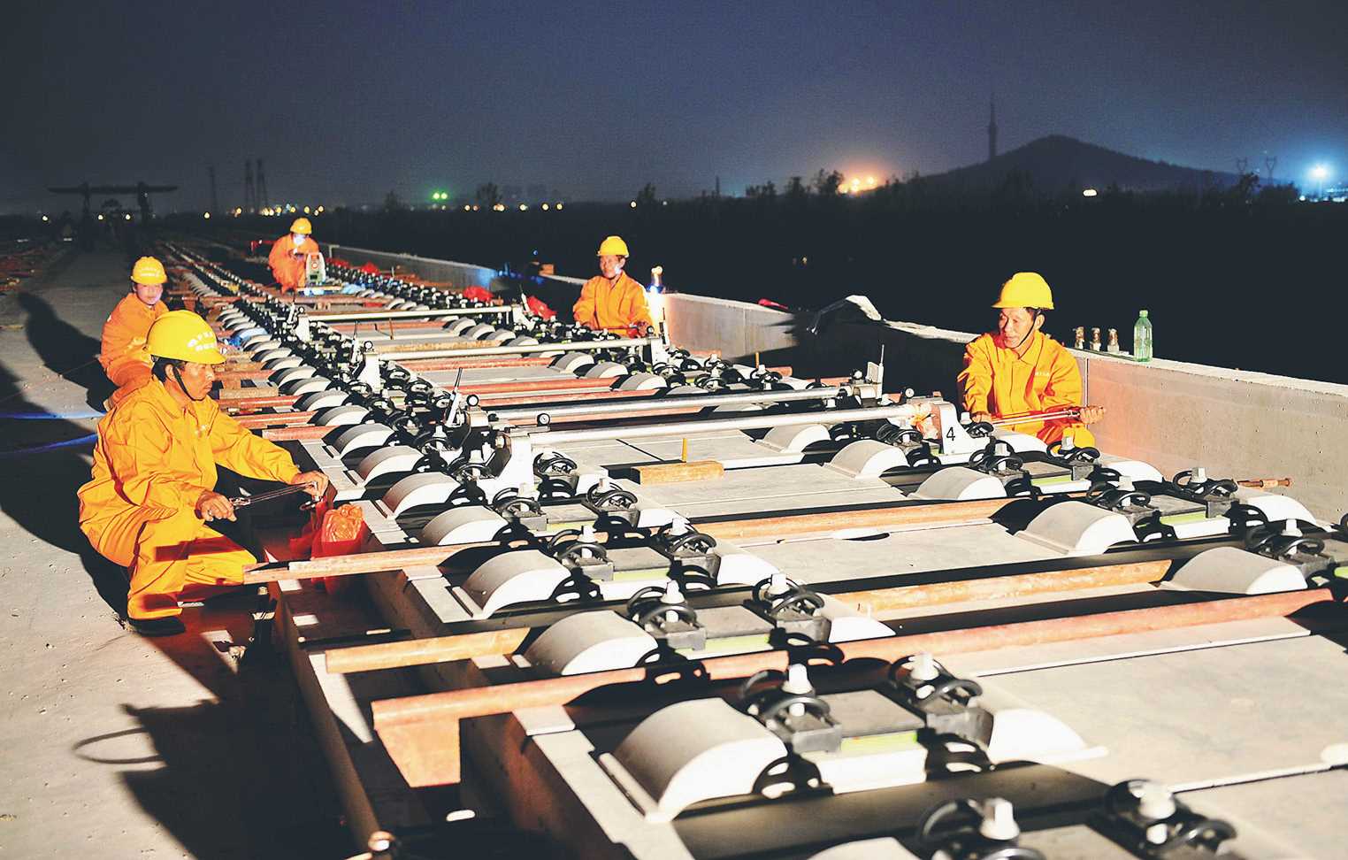 Работы по точной корректировке во время укладки безбаластного пути (фото: Чэнь Тао)