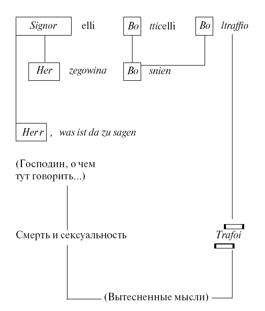 б) Объяснить исчезновение из моей памяти имени мне удалось лишь после того, как я восстановил тему, непосредственно предшествовавшую данному разговору. И тогда весь феномен предстал предо мной как процесс вторжения этой предшествовавшей темы в тему дальнейшего разговора и нарушения этой последней. Непосредственно перед тем, как спросить моего спутника, был ли он уже в Орвието, я беседовал с ним о нравах и обычаях турок, живущих в Боснии и Герцеговине. Я рассказал, со слов одного моего коллеги, практиковавшего в их среде, о том, с каким глубоким доверием они относятся к врачу и с какой покорностью преклоняются пред судьбой. Когда сообщаешь им, что больной безнадежен, они отвечают: «Господин (Herr), о чем тут говорить? Я знаю, если бы его можно было спасти, ты бы спас его». Здесь, в этом разговоре, мы уже встречаем такие слова и имена: Босния, Герцеговина (Herzegowina), Herr (господин), которые поддаются включению в ассоциативную цепь, связывающую между собой имена Signorelli (signor – господин), Боттичелли и Больтраффио.
