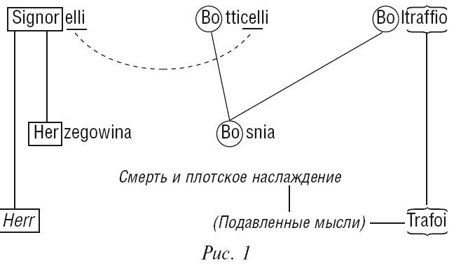 Имя Signorelli раскладывается как бы на две части. Последние два слога (-elli) воспроизводятся в точности в одном из подставных имен (Botticelli), а первые два подвергаются переводу с итальянского языка на немецкий (signor – Herr), устанавливают целый ряд сочетаний с тем словом, которое фигурировало в вытесненной теме (Herr, Herzegowina), но по этой причине выпадают из сознательного воспроизведения. Замена произошла так, будто случилось некое смещение вдоль по словосочетанию «Герцеговина и Босния», причем независимо от смысла этих слов и от звукового разграничения отдельных слогов. То есть названия механически разделились, как обычно поступают с картинками-загадками при составлении ребусов. В результате имя Синьорелли заменилось двумя другими без всякого участия сознательного ума. Поначалу не удается обнаружить никакой связи между именем Синьорелли и вытесненной темой, помимо совпадения одних и тех же слогов (точнее, сочетаний букв).