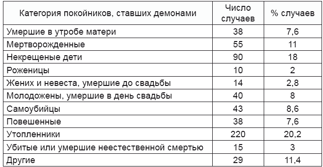 В этой весьма интересной статистике выделяется категория мертвых младенцев, умерших до крещения. В общем, они составляют 38,6 процента и утопленники – 20,2 процента. Следовательно, существовала связь между верой в привидения и трагическим обрывом переходного ритуала. В более общем смысле эту связь можно отнести к точке в пространстве или во времени, служащей границей перехода из одного состояния в другое. Так, по статистике Стомма, в более 95 процентах случаев превращения покойников в демонов они были похоронены на обочине дороги, пустыря или поля или на берегу озера. В 90 % случаев их призраки появляются в полдень, полночь, на восходе и закате солнца.