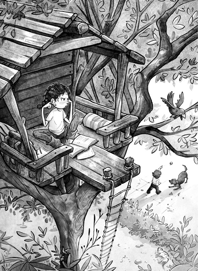После школы Альва забралась в свой домик на дереве. Там можно было спокойно заняться домашним заданием. Когда она пыталась делать уроки у себя в комнате, туда каждые пять минут заглядывал Карлос и удивлялся, что она до сих пор копается с математикой.