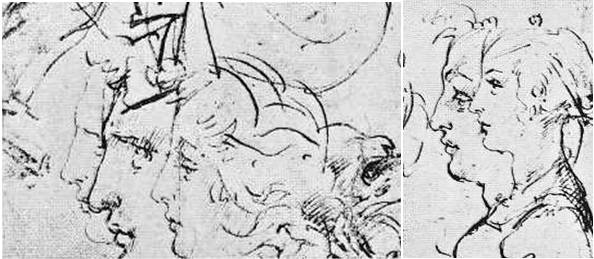 В правом фрагменте, нам кажется, что Леонардо нарисовал супружескую пару, но в действительности, он отслеживал изменение параметров одного и того же человека при переходе от юности к зрелости, почему и совмещены макушки голов.
