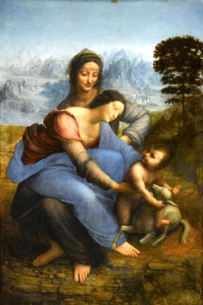 Почему в картине «Святая Анна с Марией и младенцем Христом с ягненком» (картина до реставрации и после) одна женщина сидит на коленях у другой? – это странно для человека сегодняшнего дня.