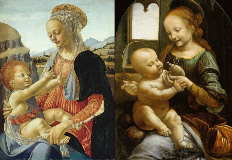 Но лучше всего «Мадонну с цветком» – молодую мамочку сравнить с «Мадонной с младенцем» раннего Леонардо, которая приписывается автору Верроккьо.
