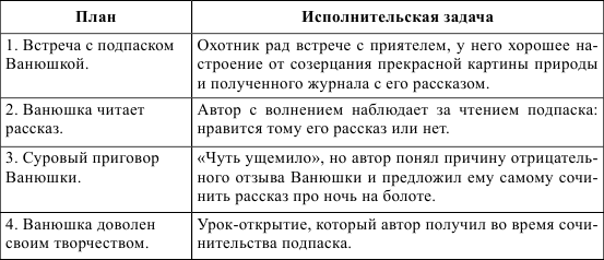 Почему же Ванюшке не понравился рассказ? Оказывается, за четверть часа подпасок прочитал всего две с половиной строчки из трехсот. Техника чтения мало-мальски грамотного героя была такой низкой, что о глубоком восприятии и понимании читаемого им произведения не могло быть и речи. И чтобы доказать подпаску, что он не совсем прав в своей оценке, автор-охотник и предлагает ему самому сочинить рассказ «по правде».