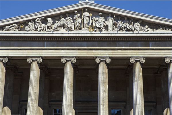 Древнегреческая храмовая архитектура в значительной мере сформировала облик европейского музея как идеала эпохи Просвещения. В 1823 г. известный английский архитектор Роберт Смёрк (Robert Smirke, 1780–1867), работавший преимущественно в стилистике неоклассицизма, создал проект здания Британского музея в Лондоне. Крылья этого массивного сооружения, по своим масштабам в два раза превосходящего Парфенон, зрительно образуют конфигурацию сцены древнегреческого театра, усиливая впечатление от фасадной части и направляя взгляд на главный вход. Он первоначально располагался в южном крыле и был украшен скульптурным фронтоном Ричарда Вестмакотта (Richard Westmacott, 1775–1856) под названием «Восход цивилизации». В центре композиции – три фигуры, символизировавшие Просвещение, в окружении аллегорий различных наук и искусств.