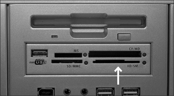 А разъем на компьютере для карты памяти находится на передней панели и выглядит следующим образом.