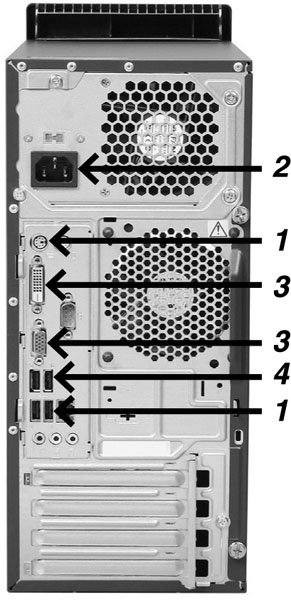 Подключение разных проводов к системному блоку: 1 – клавиатура; 2 – электричество; 3 – монитор; 4 – мышка