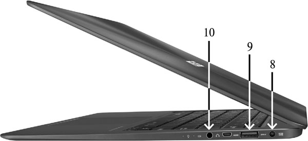 8 – гнездо для подключения кабеля для подзарядки ноутбука;
