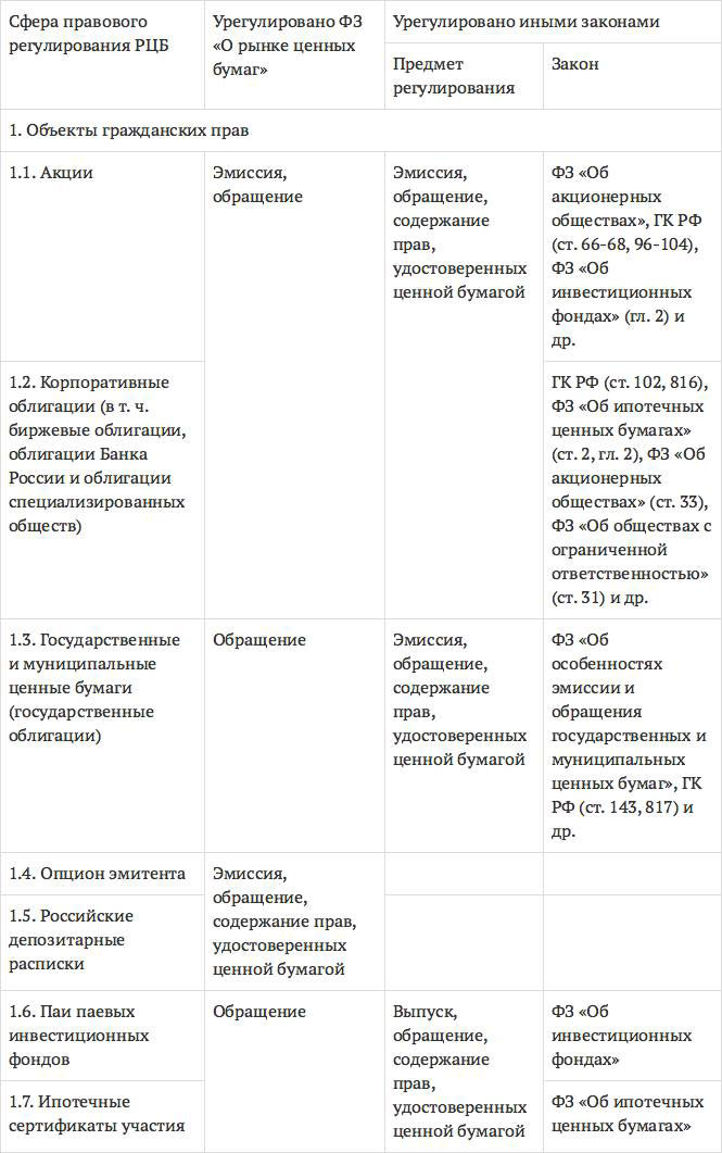 В целом, предмет правового регулирования рынка ценных бумаг включает в себя объекты и субъекты, регулирование которых осуществляется не только и не столько ФЗ «О рынке ценных бумаг» (см. таблицу 1).