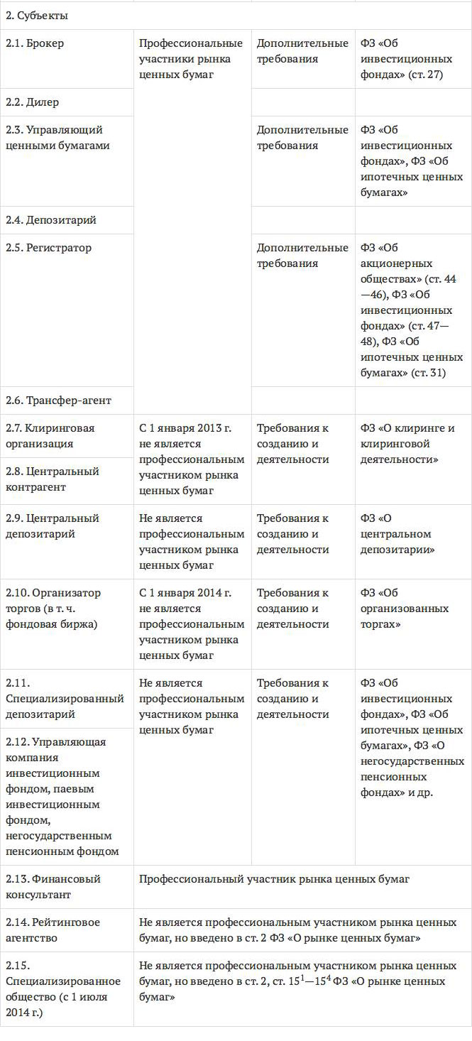 Такой широкий круг субъектов сложился не сразу. Как уже было сказано, современный этап развития законодательства о рынке ценных бумаг характеризуется активной законотворческой деятельностью государства, направленной на совершенствование инфраструктуры рынка. В 2010–2013 гг. система законодательства, регулирующего деятельность рынка ценных претерпела значительные изменения бумаг в части определения статуса его субъектов. ФЗ «О рынке ценных бумаг» постепенно утрачивает статус системообразующего закона в данной сфере: