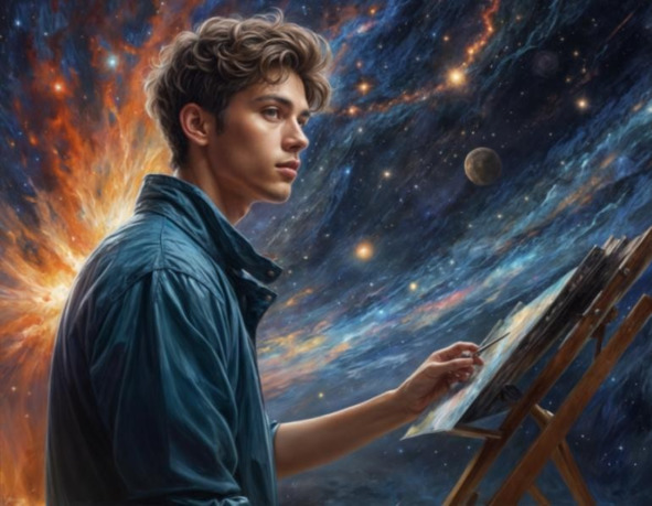 В момент, когда её пальцы коснулись ещё влажной краски, мир вокруг словно взорвался. Яркая искра космической энергии пробежала между ней и картиной, заставив воздух вокруг них