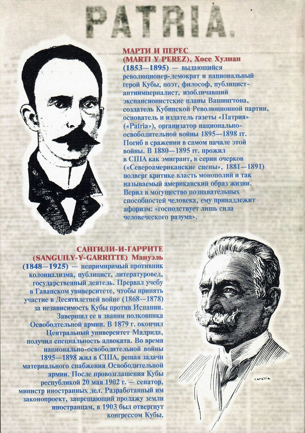 САНГИЛИ-И-ГАРРИТЕ (SANGUILY-Y-GARRITTE) Мануэль (1848 – 1925) – непримиримый противник колониализма, публицист, литературовед, государственный деятель. Прервал учебу в Гаванском университете, чтобы принять участие в Десятилетней войне (1868 – 1878) за независимость Кубы против Испании. Завершил ее в звании полковника Освободительной армии. В 1879 г. окончил Центральный университет Мадрида, получил специальность адвоката. Во время национально-освободительной войны 1895 – 1898 жил в США, решая задачи материального снабжения Освободительной армии. После провозглашения Кубы республикой 20 мая 1902 г. – сенатор, министр иностранных дел. Разработанный им законопроект, запрещающий продажу земли иностранцам, в 1903 был отвергнут конгрессом Кубы.