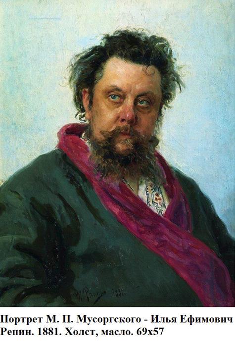 Среди портретов кисти Репина, портрет композитора Мусоргского занимает особое место. К сожалению до наших дней дошло не всё творение мастера, а лишь только средняя и верхняя части картины. Низ, как утверждал в своих рассказах прислуге дворник Николаша, был обрезан и использован в качестве обёрточной бумаги, куда Илья Ефимович однажды завернул свежих карпов, которые ему принес сосед по подъезду, с которым он частенько бухал. Изначально композитор был изображён с обнажёнными ногами, выступавшими из-под пол халата. Ноги на картине были выведены слишком реалистично, отчего всё внимание с лица переключалось на низ картины, бросалось исключительно на босые ноги Модеста Петровича. Как известно, мастер писал этот портрет за несколько дней до смерти великого композитора, что придает работе особую драматичность и глубину. Перед нами очевидно серьезно больной человек: нездоровая краснота лица, блестящие глаза. Семь дней, неделю мужчина непрерывно пил. Сильнейший запой, обусловленный шальным музыкальным заказом. Целых триста рублей композитор получил за небольшую музыкальную композицию, заказанную для французского императорского двора… Автор полотна концентрирует внимание зрителя именно на лице композитора, словно пытаясь передать секрет гения Мусоргского, который только-только начал выходить из запоя. Взъерошенные волосы, запущенная борода с усами, не отвлекают нас от главного, от шизоидного взгляда алкоголика-композитора. В его глазах читается печаль, тоска. Следы белой горячки тоже отчётливо видны на фоне простой больничной одежды. Одновременно с этим зритель видит глаза энергичного и сильного человека, надломленного пьянством и другими нехорошими излишествами. Больничный халат, вышитая рубашка – украинская вышиванка, написаны художником схематично, они не подчеркивают болезненность, или, к примеру, национальную принадлежность или сексуальную ориентацию, а лишь призваны служить обрамлением главного – лица, головы, вызывающий поворот которой позволяет думать, что до последнего мгновения жизни этот человек боролся со своим недугом и житейскими мужицкими слабостями. Известно, что при написании портрета Илья Репин и Модест Мусоргский неплохо покутили. А почему нет? Деньги были, закуска была… Как говорится, всё было, и слава Богу!