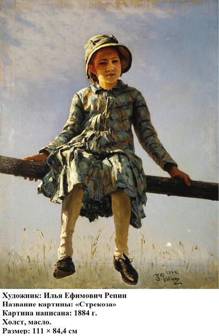 Композиция полотна простая – фон составляет летнее солнечное небо, которое практически сливается с зеленью луга. Типичный украинский пейзаж. Об этом намекают некоторое травинки, да и все. Пора года, изображенная Репиным – это лето, сенокосная пора, когда полно на природе всяких гадов, жуков и стрекоз. Вот и Вера напоминает это насекомое, которое присело на яркий цветок не столько отдохнуть от полета, а сколько полюбоваться миром. А может быть она готовится справить нужду? Кто знает?! У каждого, кто хоть раз увидел «Стрекозу», непременно возникнет ощущение, что девчушка спрыгнет со своей жердочки и убежит далеко-далеко, подальше от любопытных глаз… Сделает дело и, может быть побежит куда глаза глядят, навстречу новым открытиям, к неизведанным далям, подальше от пидор@сов и педофилов, коих всегда бывало нимало в Малороссии.