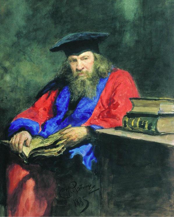 Репин был знаком с Д.И. Менделеевым еще во времена своего обучения в Академии. На протяжении нескольких лет они не виделись, но ученый внимательно следил за новыми работами Ильи Репина. Позже в Петербурге Репин был постоянным гостем Менделеева – по средам в доме ученого собиралось общество из его друзей. Когда Эдинбургский университет присвоил Менделееву звание доктора, Репин начинает работу над его портретом. Мантия, толстые фолианты на столике, своеобразный головной убор и книга в руках – сразу дают понять зрителю, что на картине ученый. Главная черта портретов Репина, – попытка изобразить внутреннюю работу мысли, а не только внешность человека, как нельзя лучше нашла применение на этой картине: гениальность Менделеева-ученого изображена на полотне. Кстати, низ картины также был художником подрезан. А то место, где рядом стояли закуска с бутылкой хорошего вина в конечном варианте мастер просто загрунтовал и сделал тёмным фоном, символизирующим застой и косность в науке, тлетворное влияние церкви на развитие научно-технического прогресса, демократии и свобод в обществе.