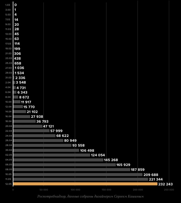 По состоянию на утро 12 мая в России зафиксировано 232 243 случая заболевания COVID-19, в том числе 10 899 случаев за прошедшие сутки. Такие данные публикует федеральный штаб по борьбе с коронавирусом (10:38, 12 мая 2020).